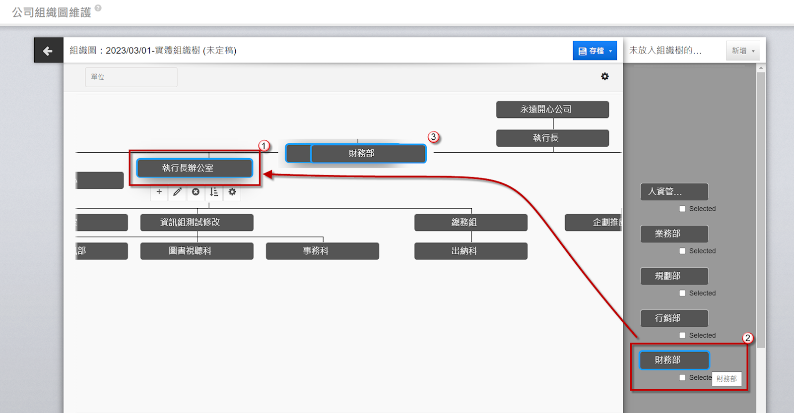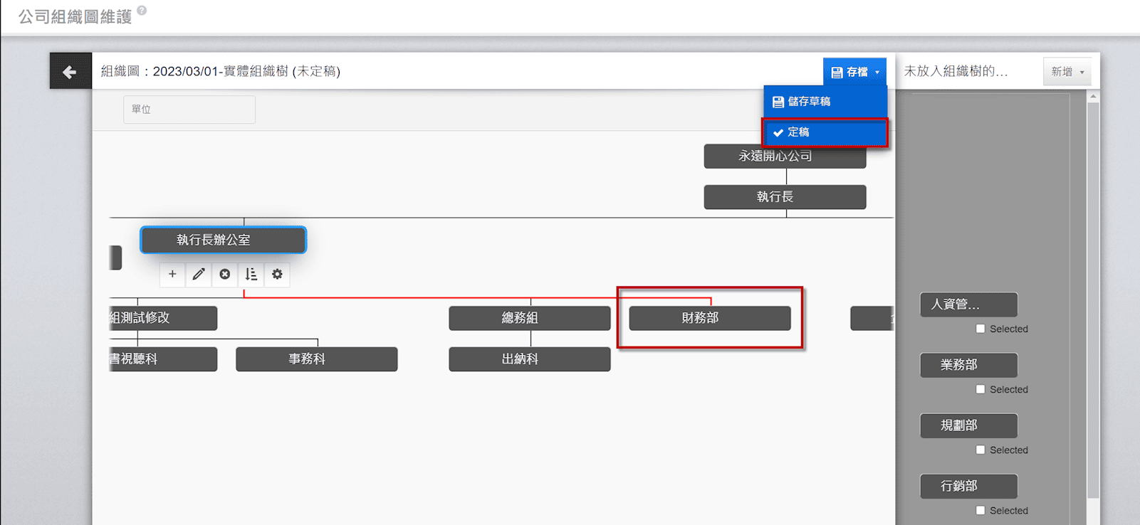 放開後出現紅線即代表新增單位已拉進組織圖,再執行存檔定稿