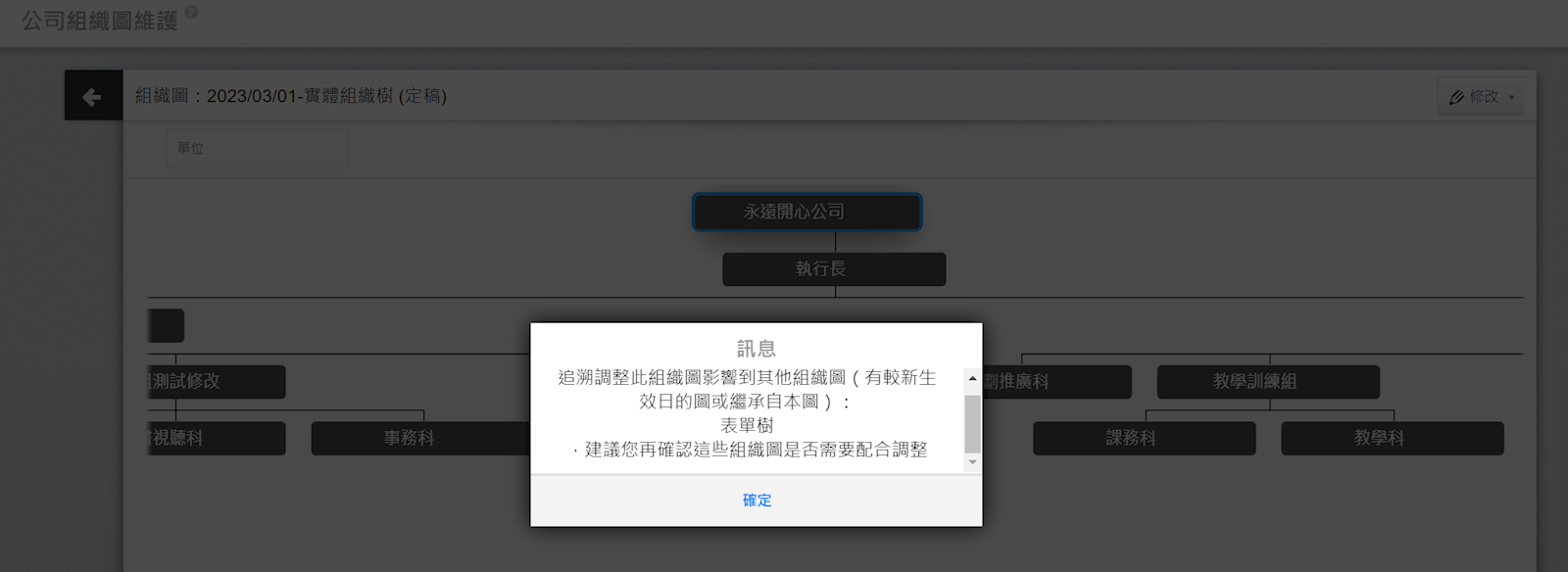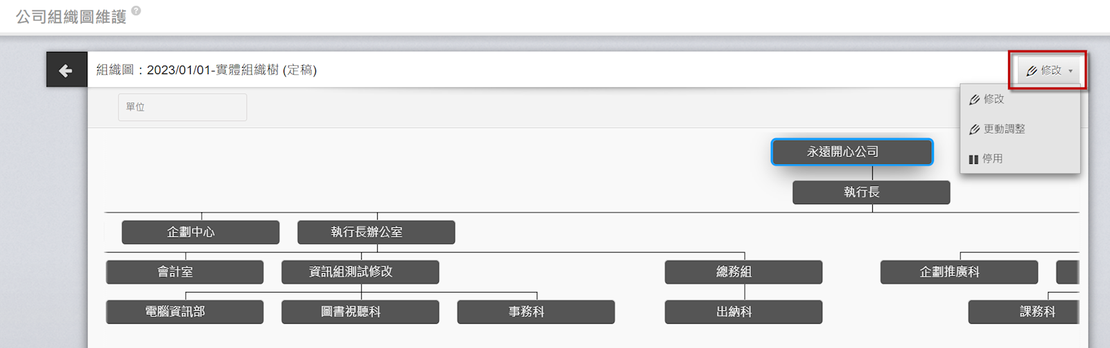 “修改”是指編輯目前的組織圖,不會新增異動歷程