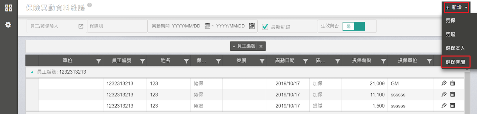 2. 進入頁面後,於右上方點選【新增】按鈕,展開下拉選單後,選擇「健保眷屬」