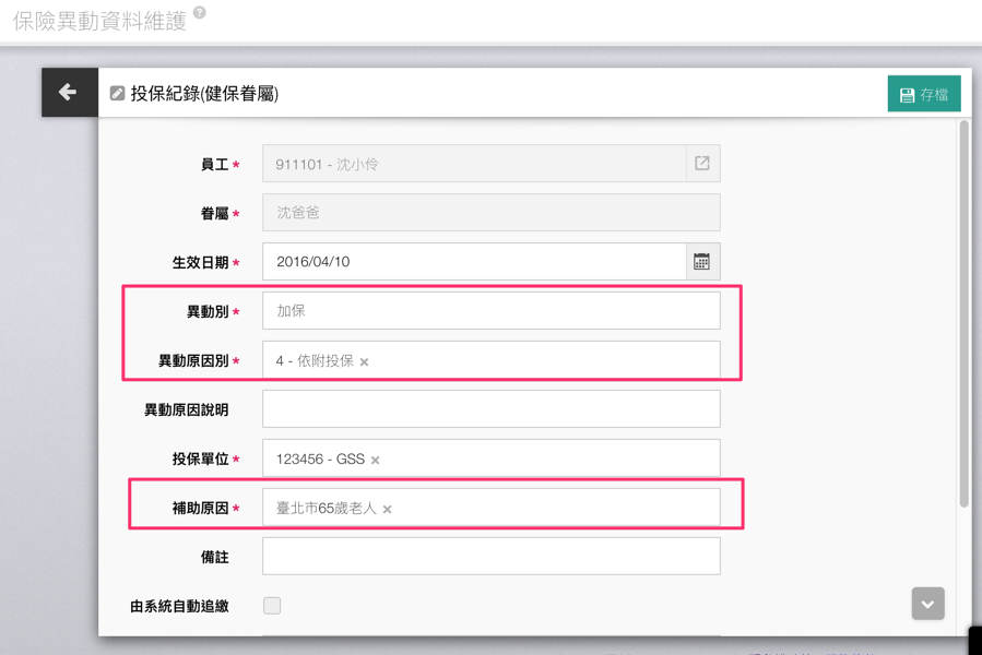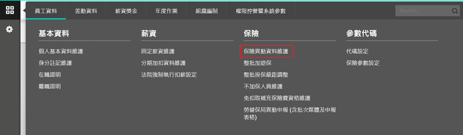 1. 請至功能選單中,選擇【員工資料>保險>保險異動資料維護】