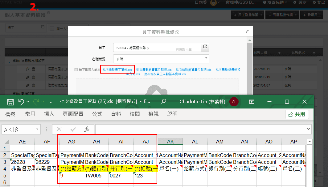 2.【個人基本資料維護】員工整批作業-員工資料整批修改,下載那個同仁的資料,把給薪方式改成9,後面改成現在要轉入的銀行和帳號