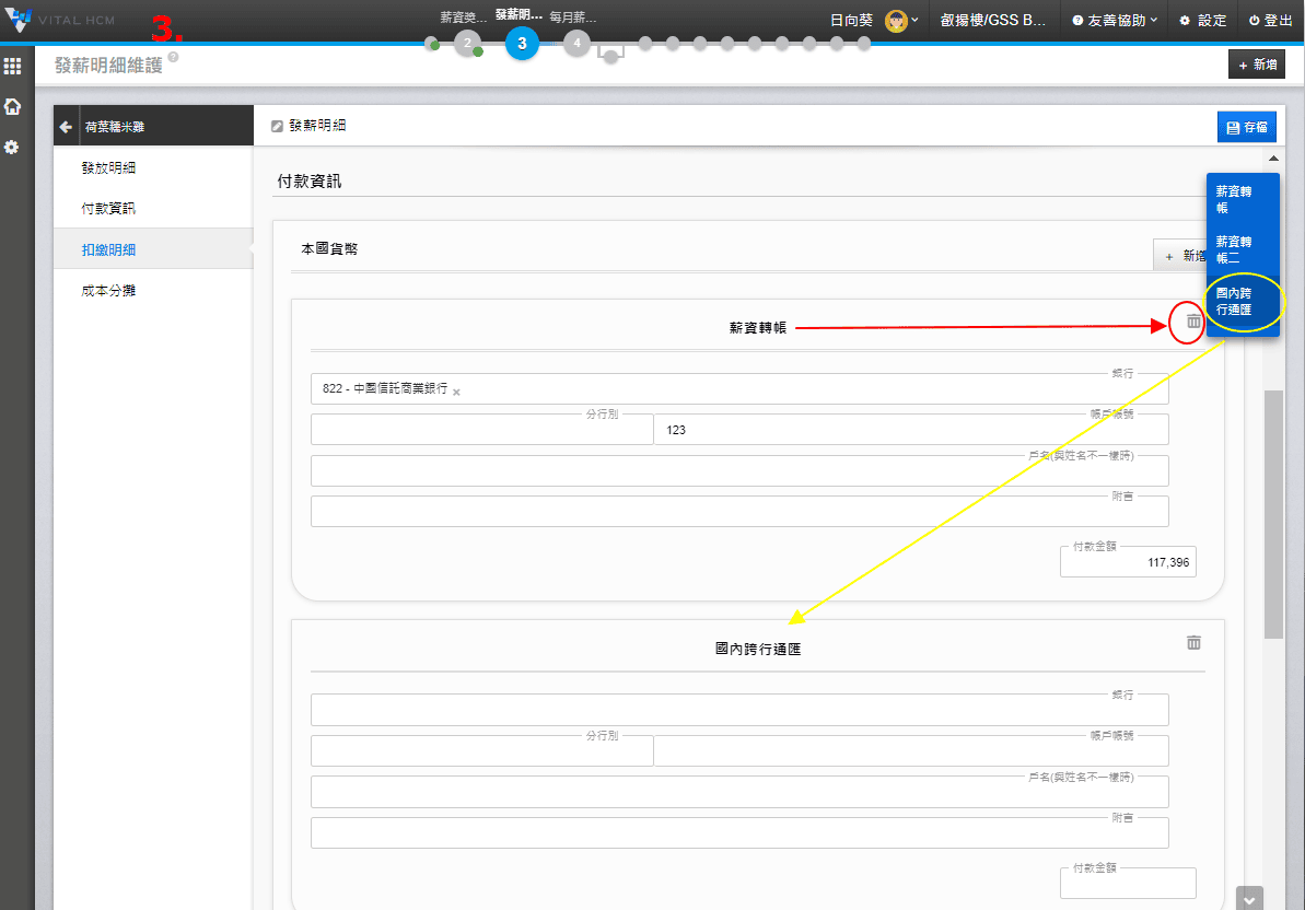 3. 要是當月薪資已經算好了,需要多一步驟,【發薪明細維護】一樣要改已經算出來的發薪明細,刪掉付款資訊原本的”薪資轉帳”,新增”國內跨行通匯”,和轉帳資料
