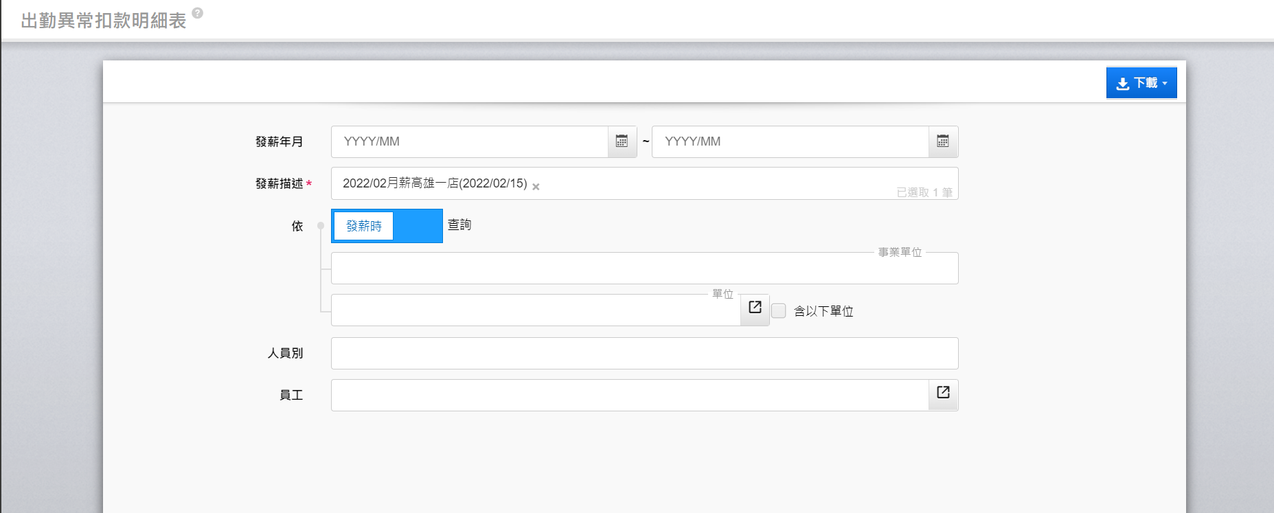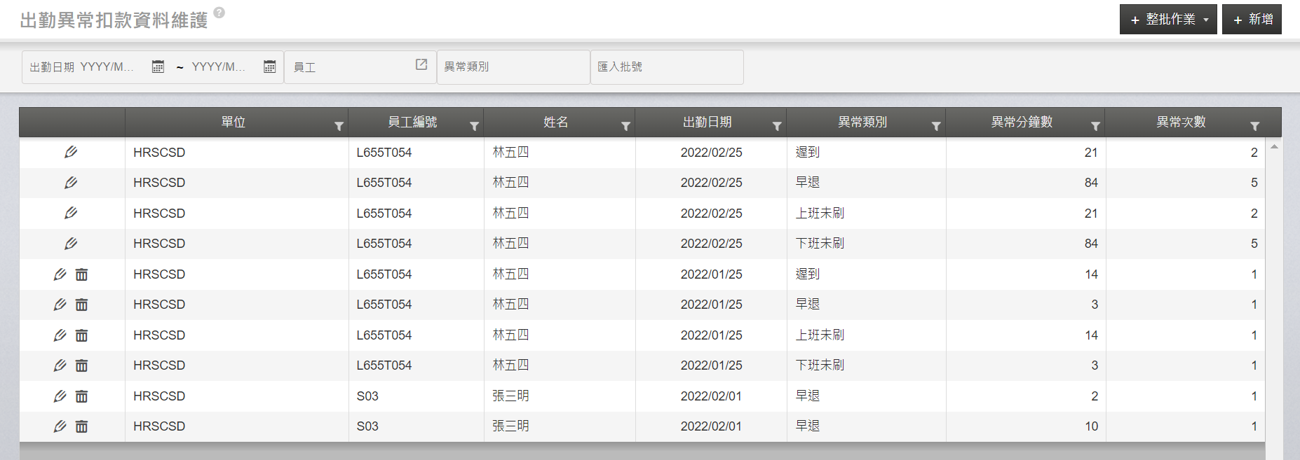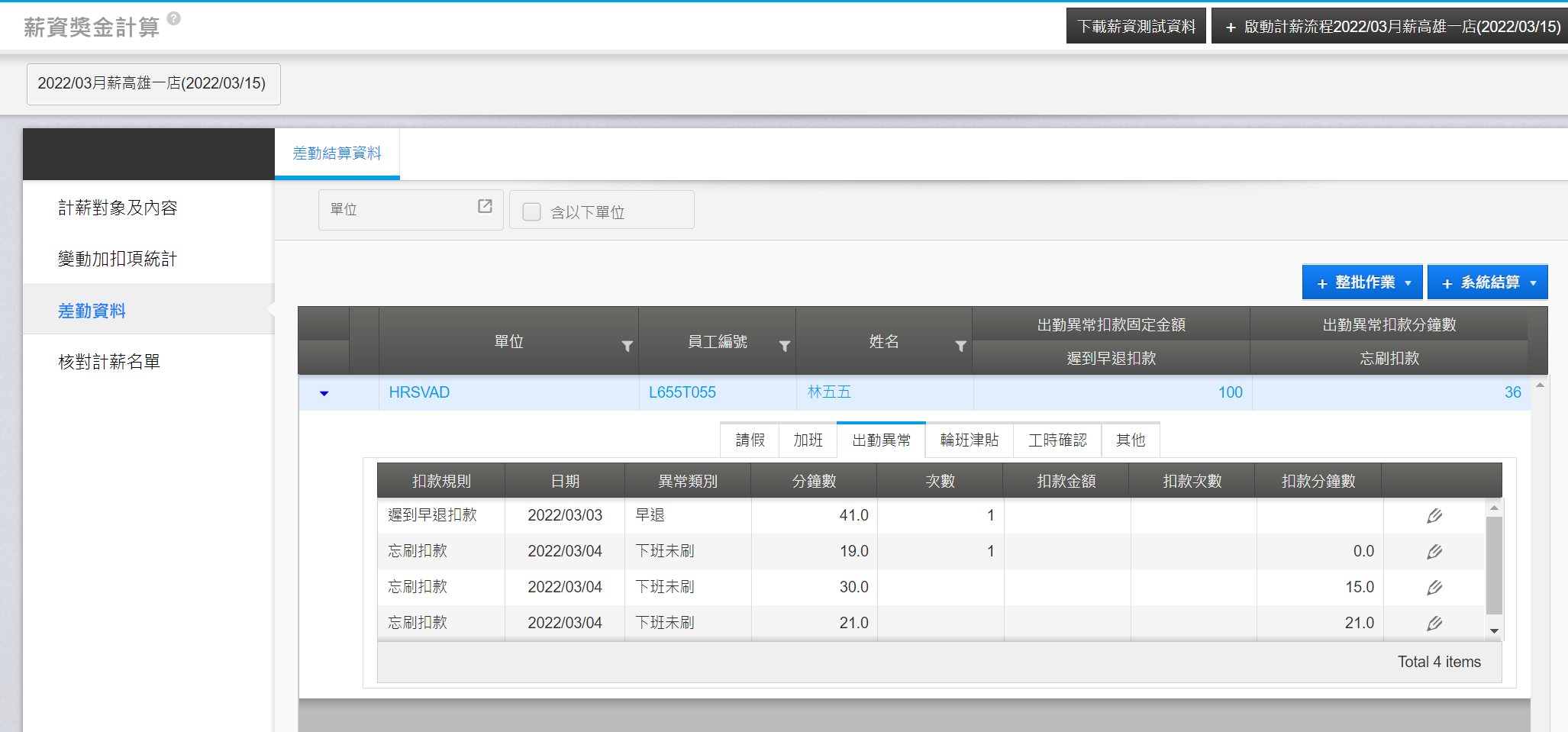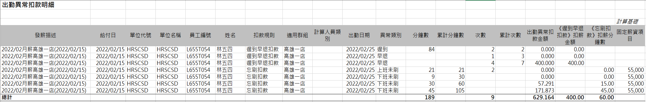 - 出勤異常扣款明細表:核對計算後的扣款金額及規則是否正確