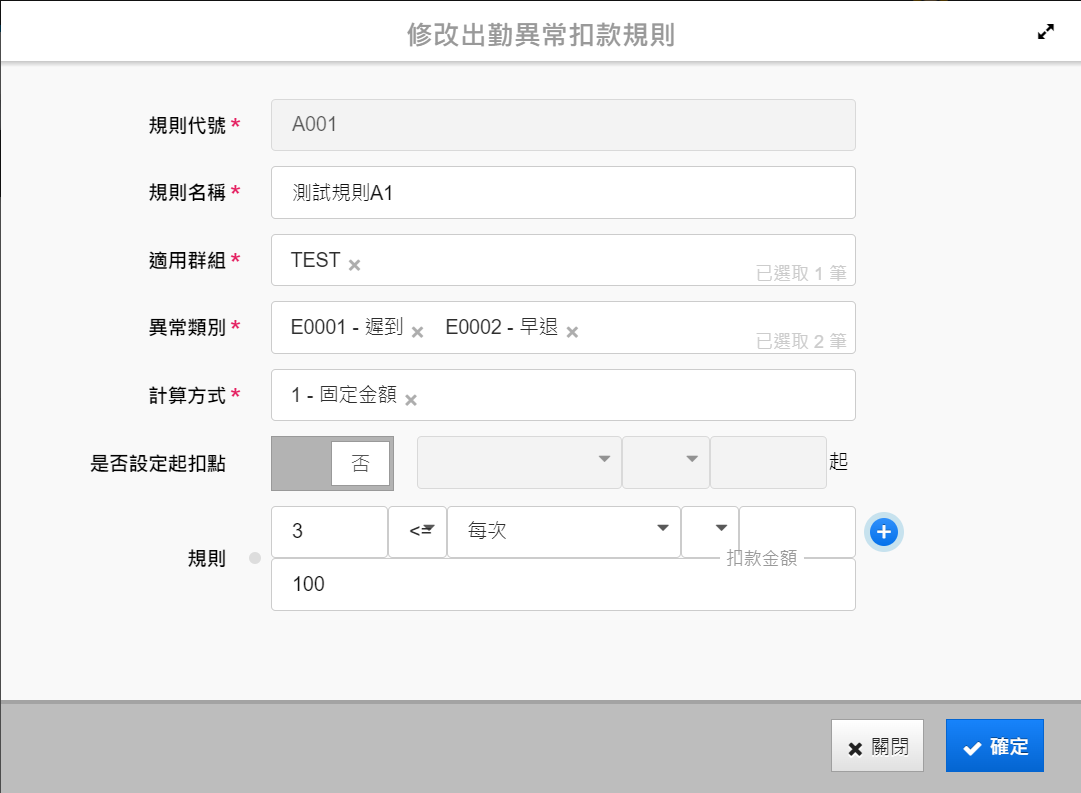 扣款規則可指定異常類別、計算方式、累計規則及金額