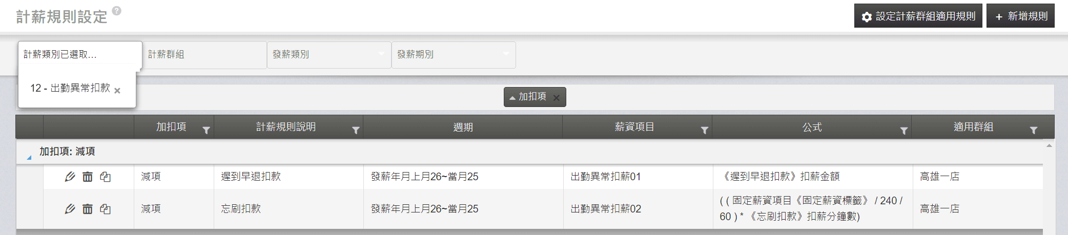 - 計薪規則設定:可設定異常扣款計算的公式,例:遲到扣薪分鐘數*(時薪/60)