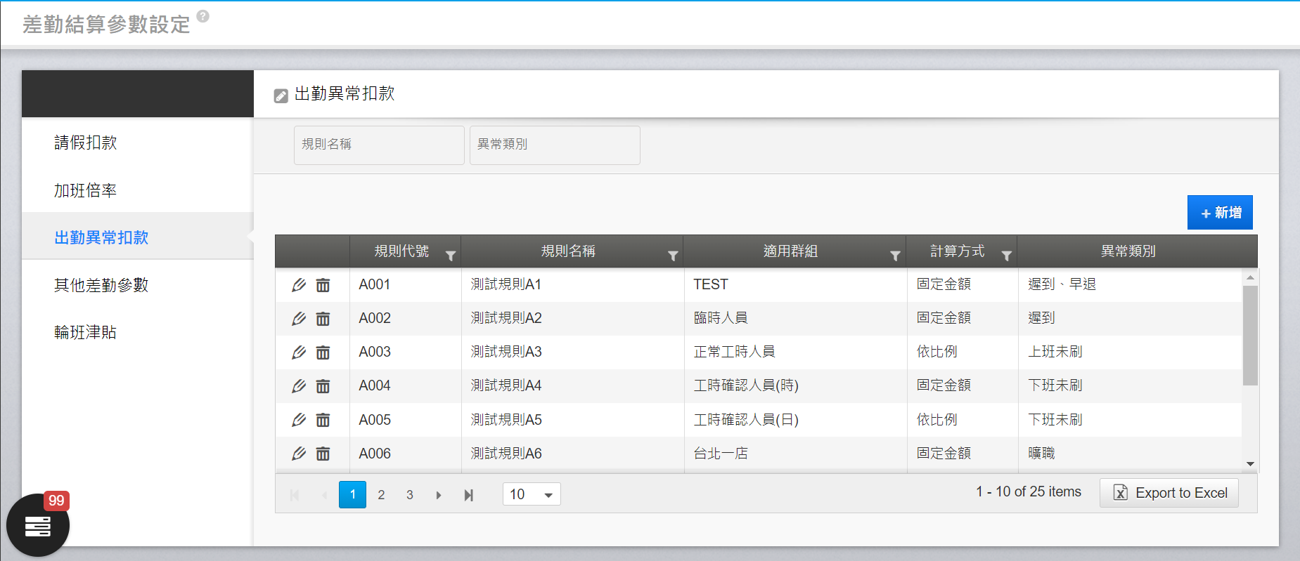 - 差勤結算參數設定-出勤異常扣款:新增出勤異常扣款的規則,扣款規則可指定異常類別、計算方式、累計次數規則及扣薪金額