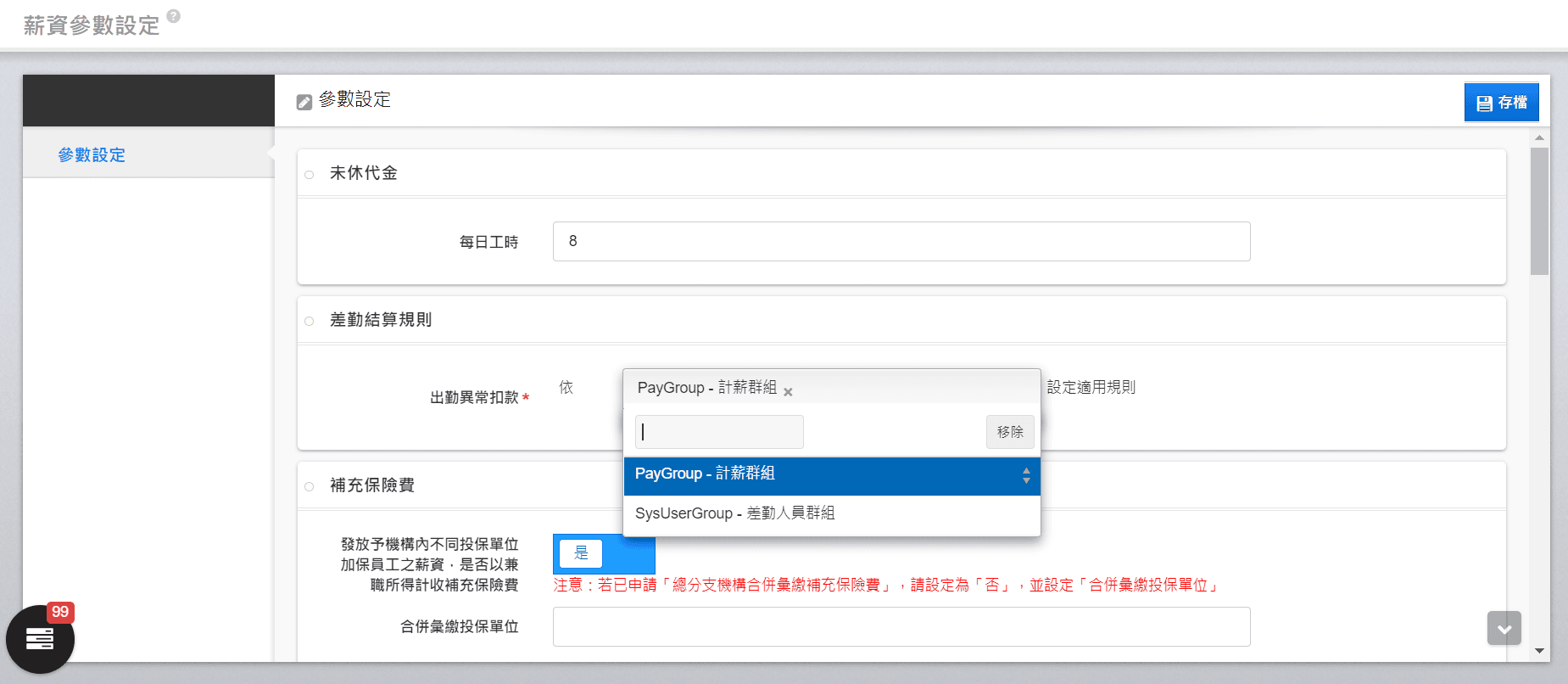 - 薪資參數設定:依客戶需求可設定使用計薪群組或差勤人員群組套用規則;預設為"計薪群組"
