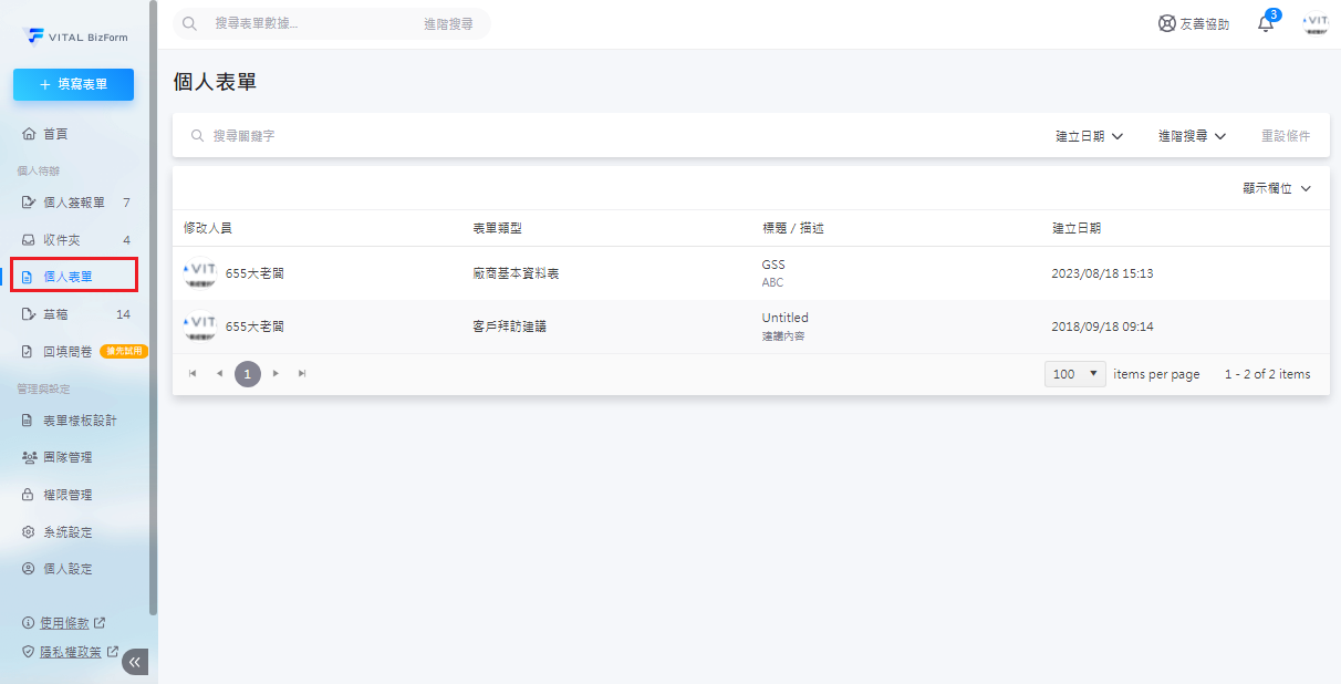 若是您是新增一般表單,您可以在首頁左方工作列【個人表單】做查看