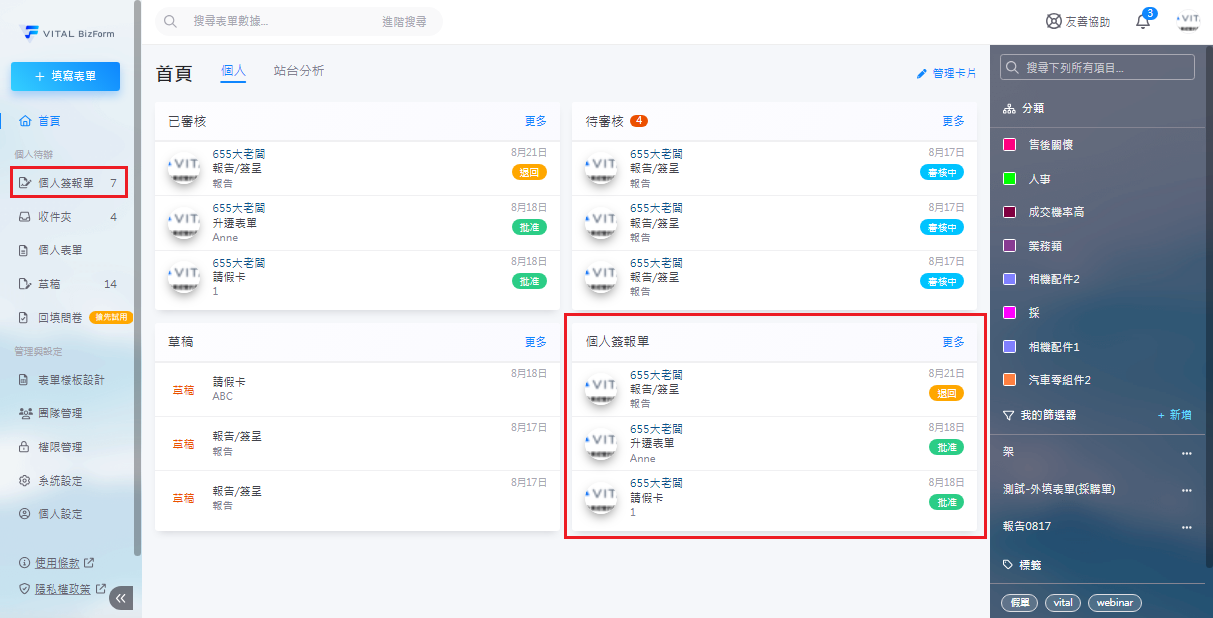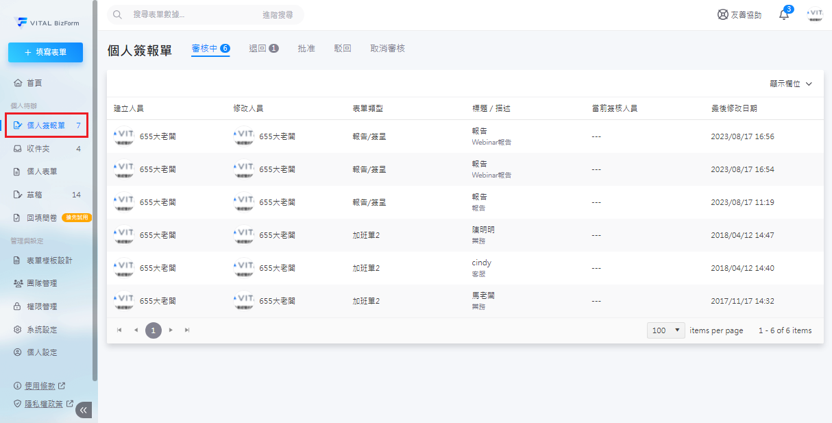 若是您是新增簽核表單,您可以在首頁的【待處理】、【個人簽報單】查看或是點選左方工作列的【個人簽報單】查看