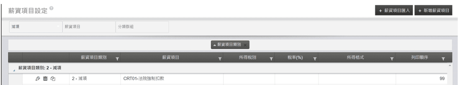 一、點擊【薪資獎金>薪資參數>薪資項目設定】,原本使用的法扣項目仍可繼續使用,一家公司只會有一個法扣項目