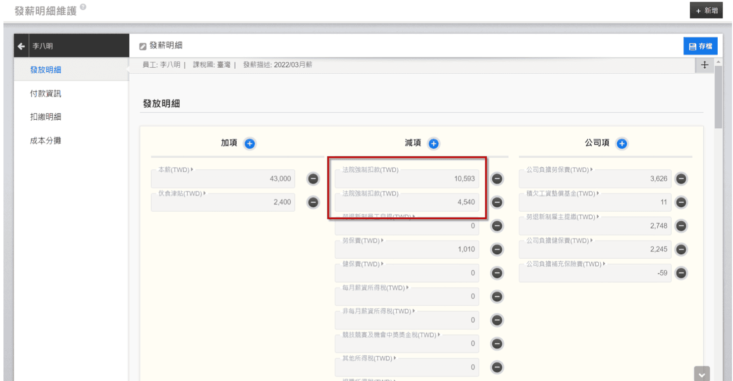 三、點擊【員工資料>薪資資料>法院強制執行扣薪設定】
