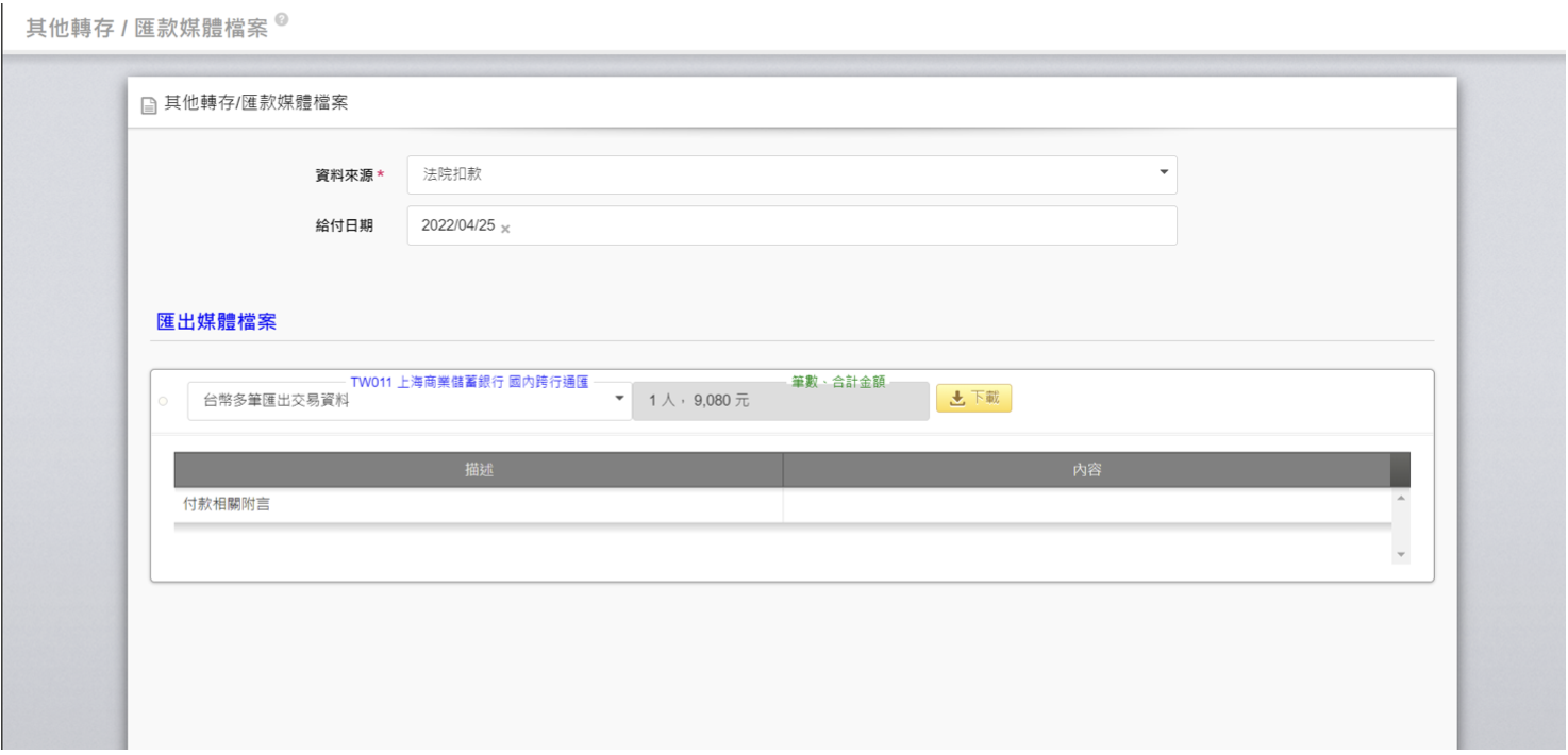 六、【薪資獎金>計算及發放>其他轉存 / 匯款媒體參數設定】 債權人已設定受款銀行及還款方式為匯款者,可產出匯款媒體格式