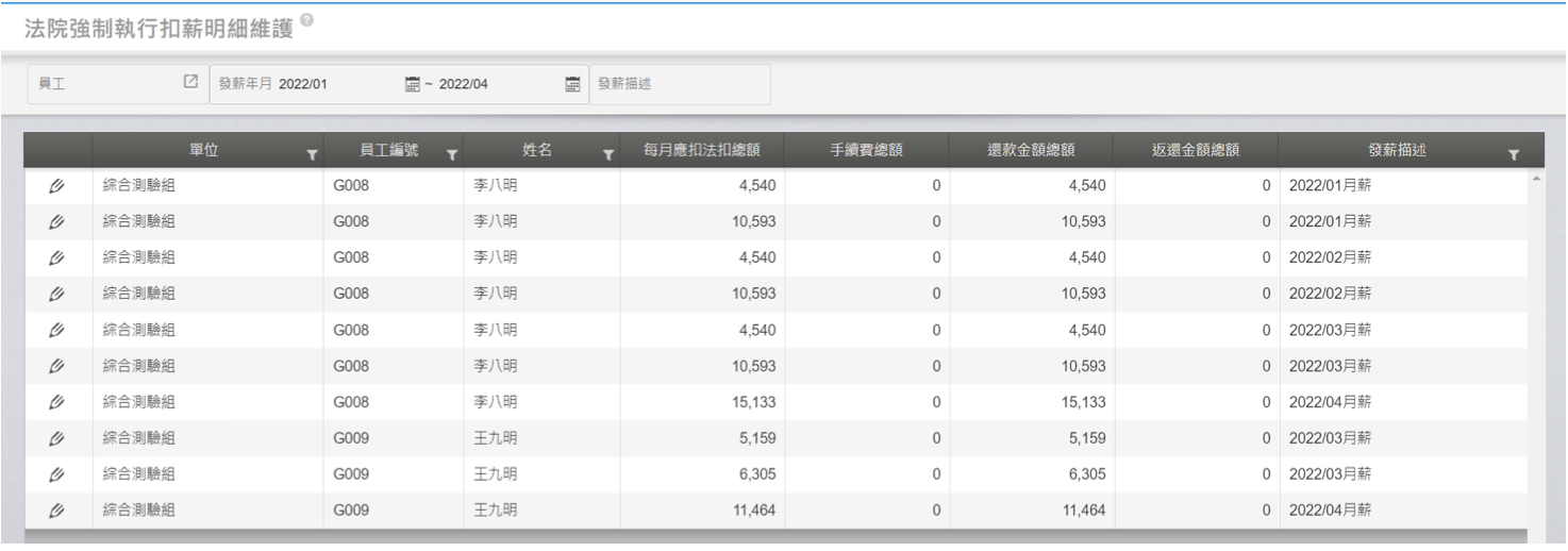 五、若有需要調整每月計算後的法扣項目金額,請至【薪資獎金>計算及發放>法院 強制執行扣薪明細維護】中修改