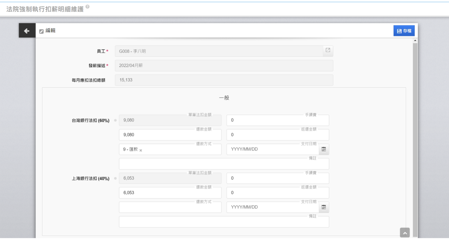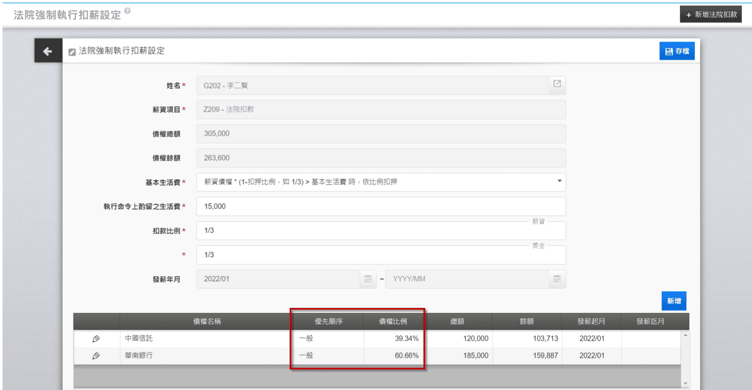 ii.【債權比例】將於系統執行薪資計算後,依照債權總額計算比例,若還款金額不依照債權比例,請於計薪後至【法院強制執行扣薪明細維護】調整金額