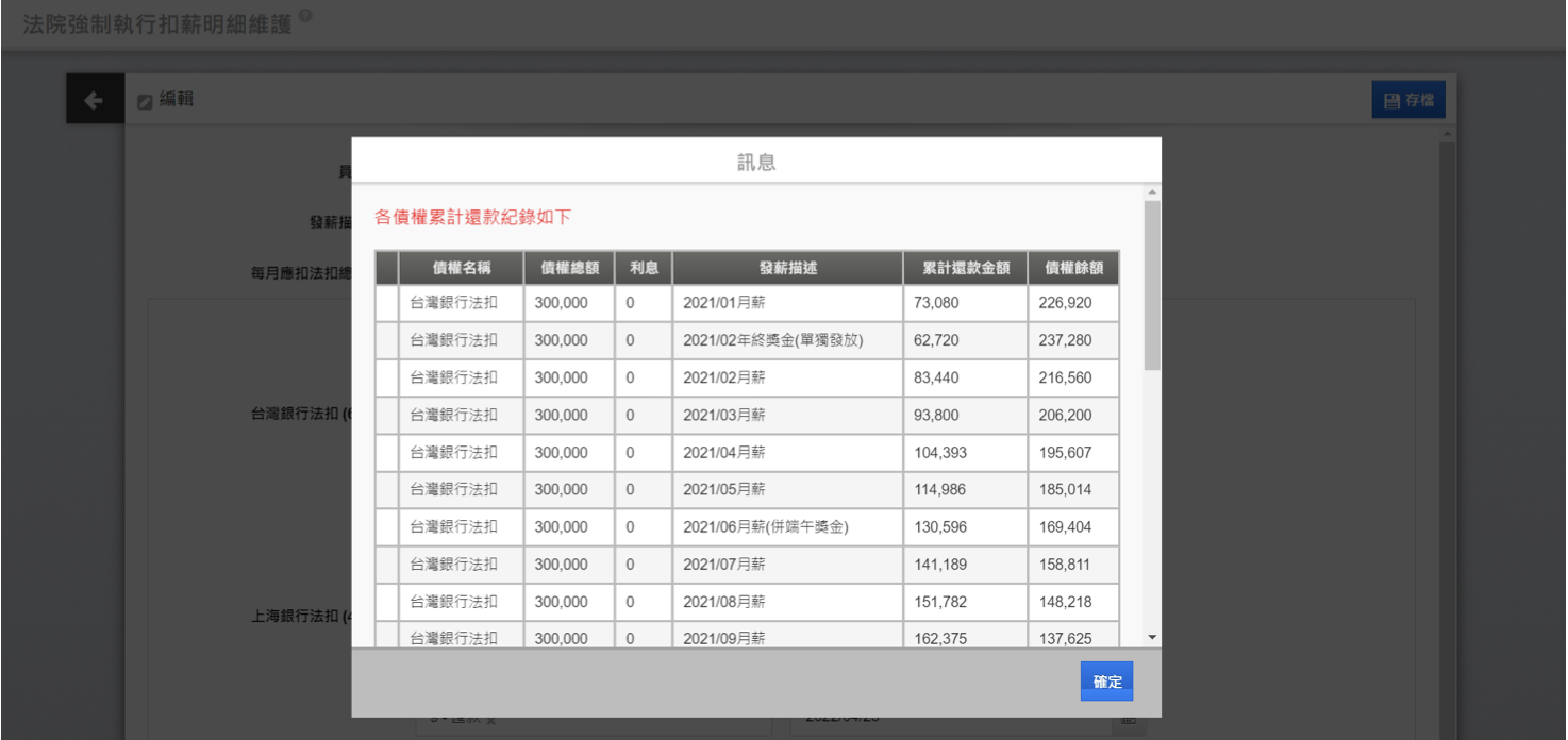 修改後執行存檔,可檢視各債權累計還款紀錄