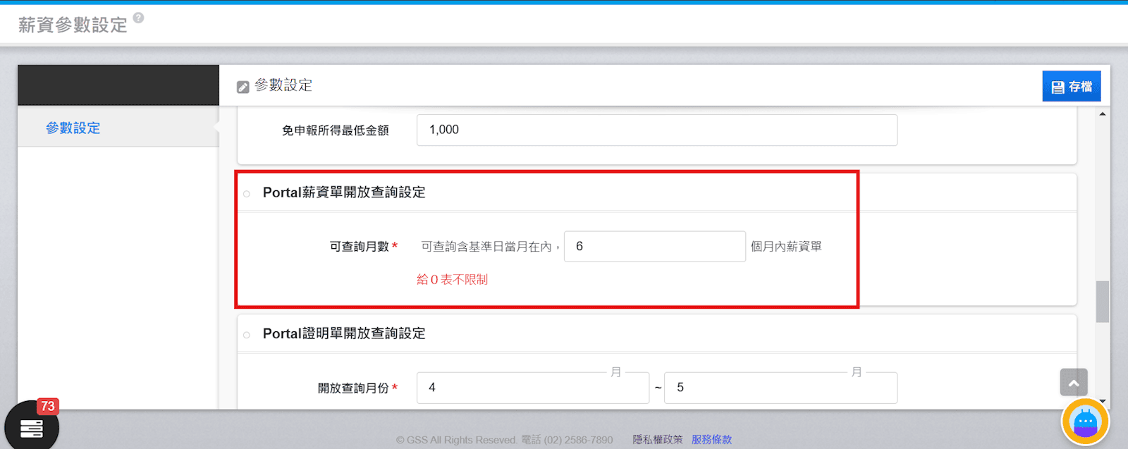 2. 下拉至【Portal 薪資單開放查詢設定】,輸入開放查詢的月數後按【儲存】即完成設定。