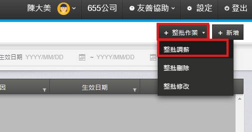 2. 進入畫面後,點選右上角的【整批作業>整批調薪】。