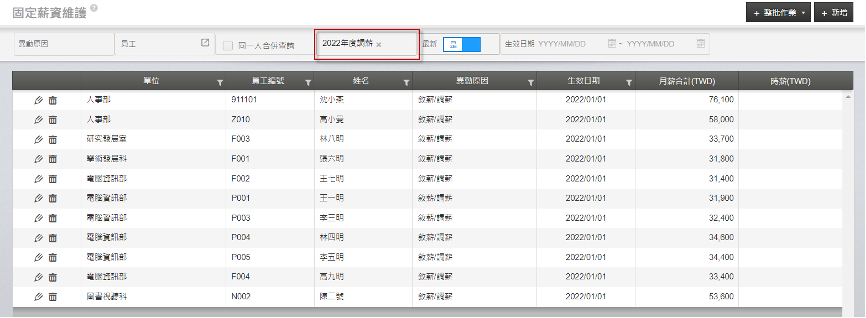 您可以透過「固定薪資維護」的整批調薪,整批調整員工的核薪資料。請參照以下的詳細步驟:
