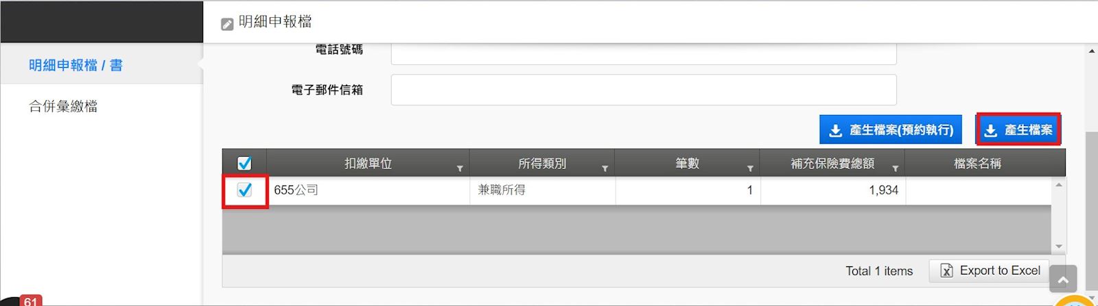 2. 在【明細申報檔/書】中勾選扣繳項目後點選【產生檔案】即可下載 Excel。