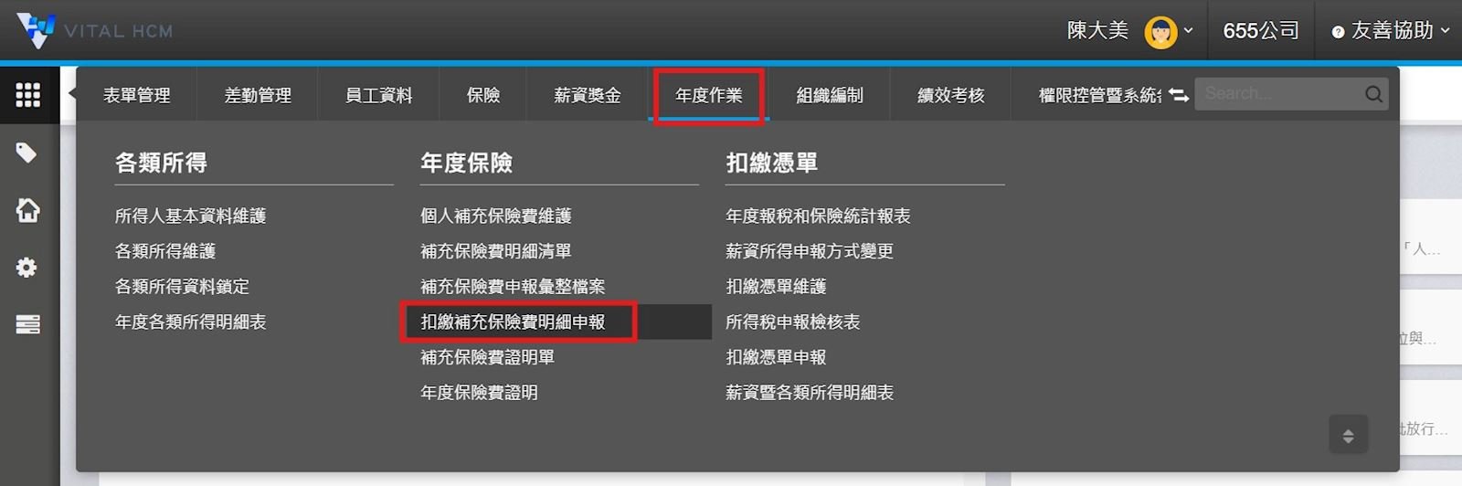1. 請點選【全站功能】>【年度作業>扣繳補充保險費明細申報】。