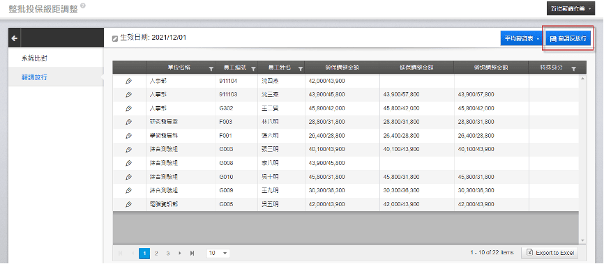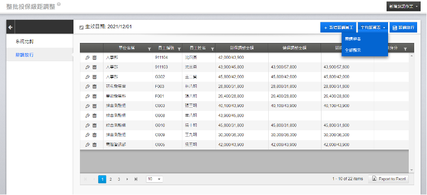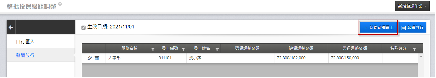您可以透過「整批投保級距調整」的系統比對或自行輸入,整批調整員工的投保級距。