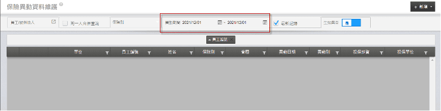 在上方的查詢條件輸入「薪調生效日」,即可查詢放行後產生的保險異動記錄。