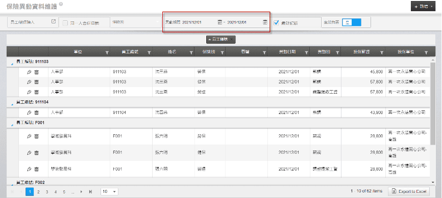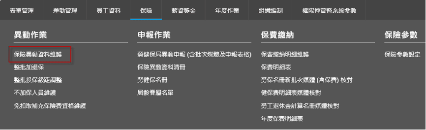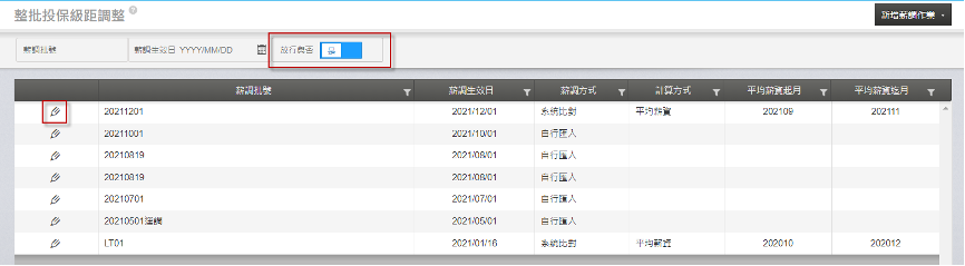 6. 整批投保級距調整作業放行後,可至【保險>異動作業>保險異動資料維護】查詢放行的結果。