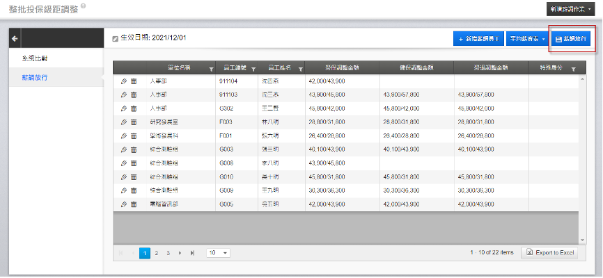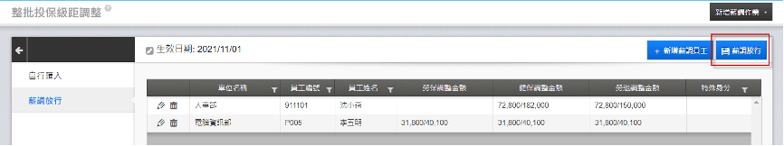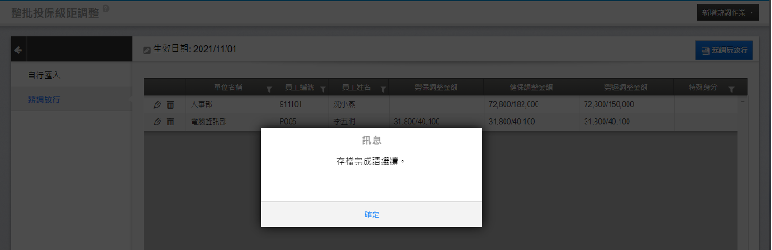 4. 當確認薪調人員及調整前後金額均正確無誤後,執行「薪調放行」。