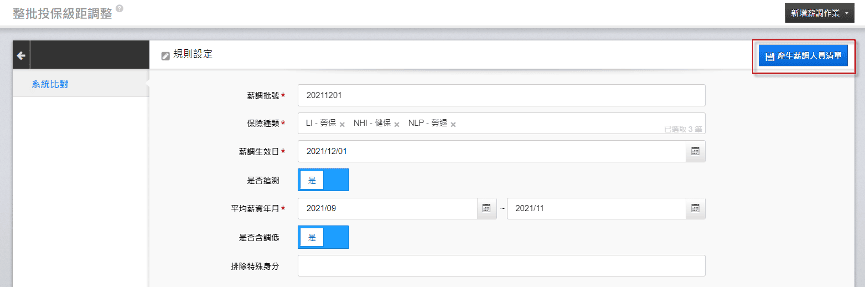 1. 輸入規則設定的相關欄位後,點選右上角「產生薪調人員清單」。