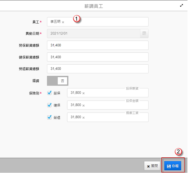 3. 若有額外需納入調整的員工,可點選「新增薪調員工」,直接輸入資料並執行「存檔」。