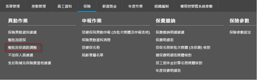點擊【保險>異動作業>整批投保級距調整】。