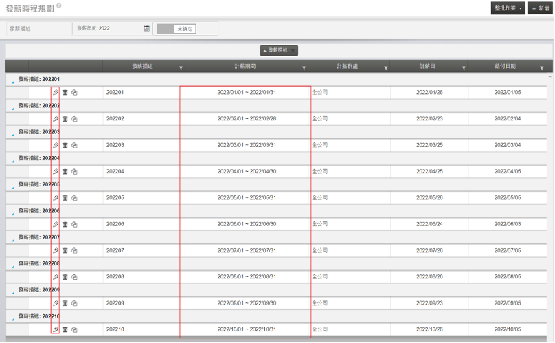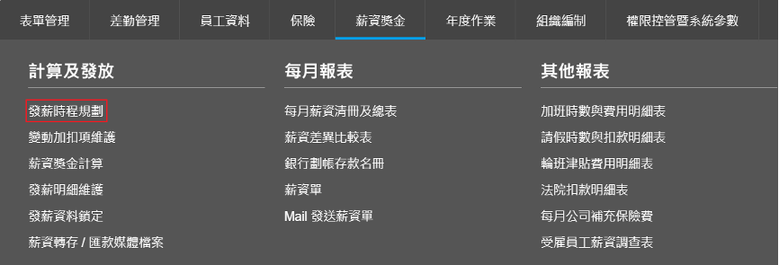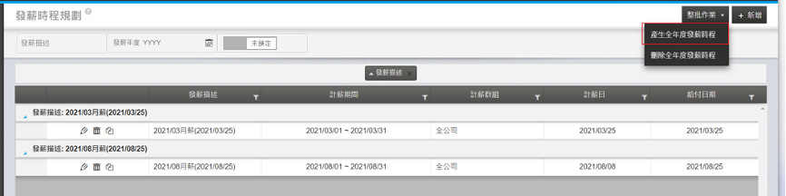 1. 請至【全站功能>薪資獎金>計算及發放>發薪時程規劃】,透過整批作業產生全年度發薪時程。