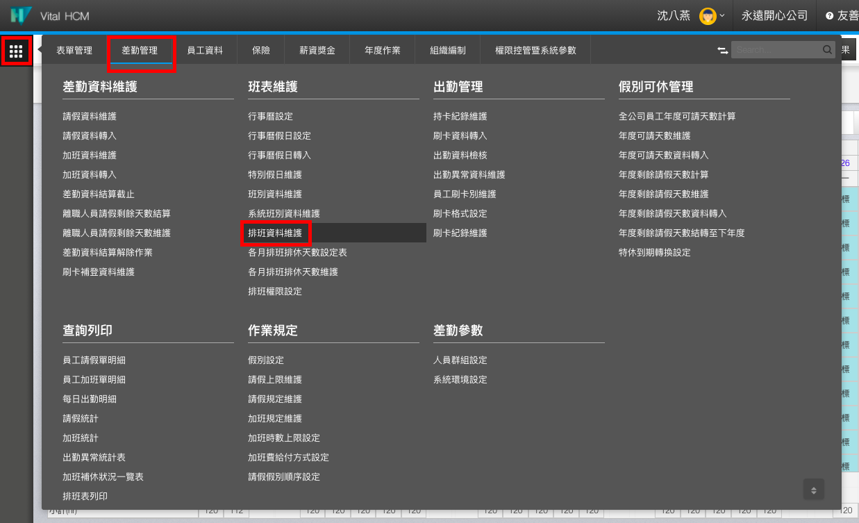 點選首頁左方的【功能清單】,接著點選【差勤管理>班表維護>排班資料維護】。