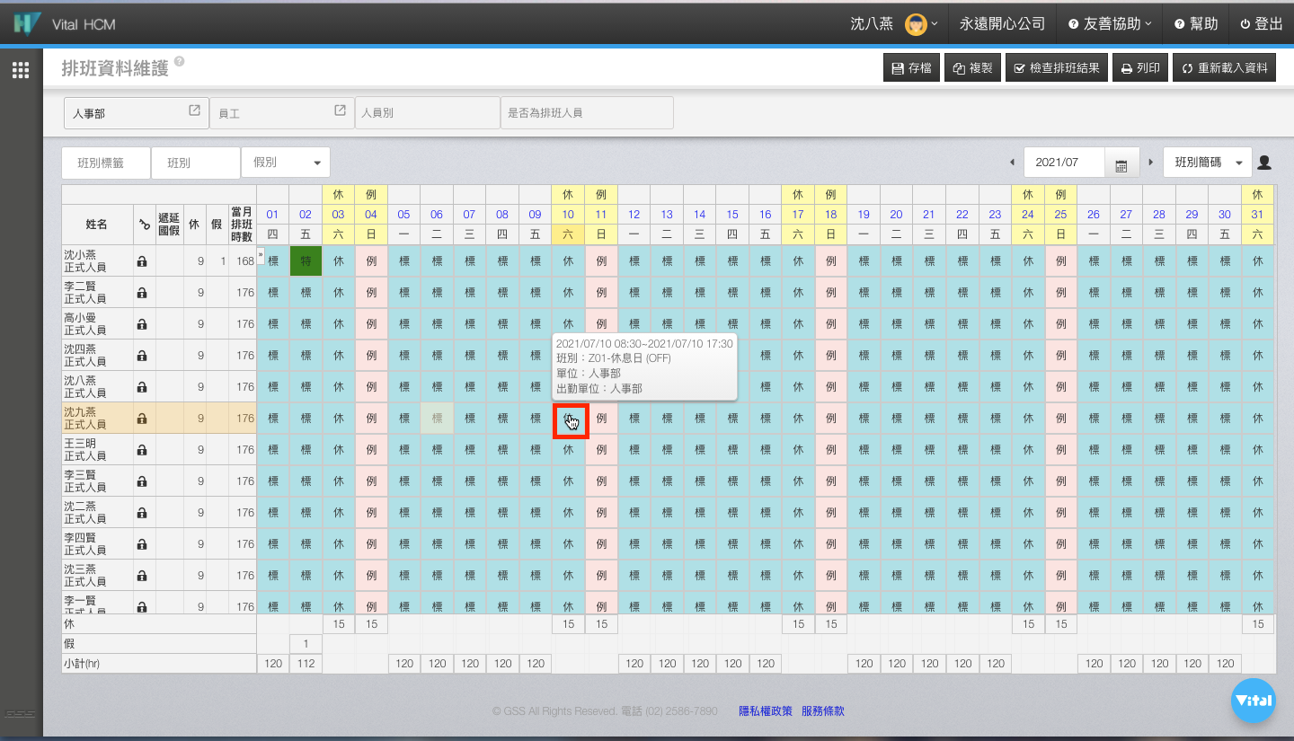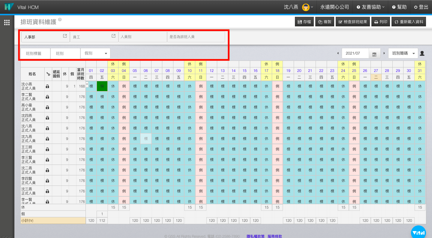 進入畫面後,您可以看見所有員工的班表,或是利用上方的欄位,篩選出不同部門、特定員工的排班資料。