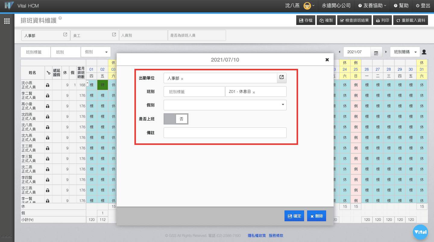 您可以在彈跳視窗中,輸入排班資訊,並勾選該員工那天是否需要上班,資訊輸入完畢,點擊下方確認即可。