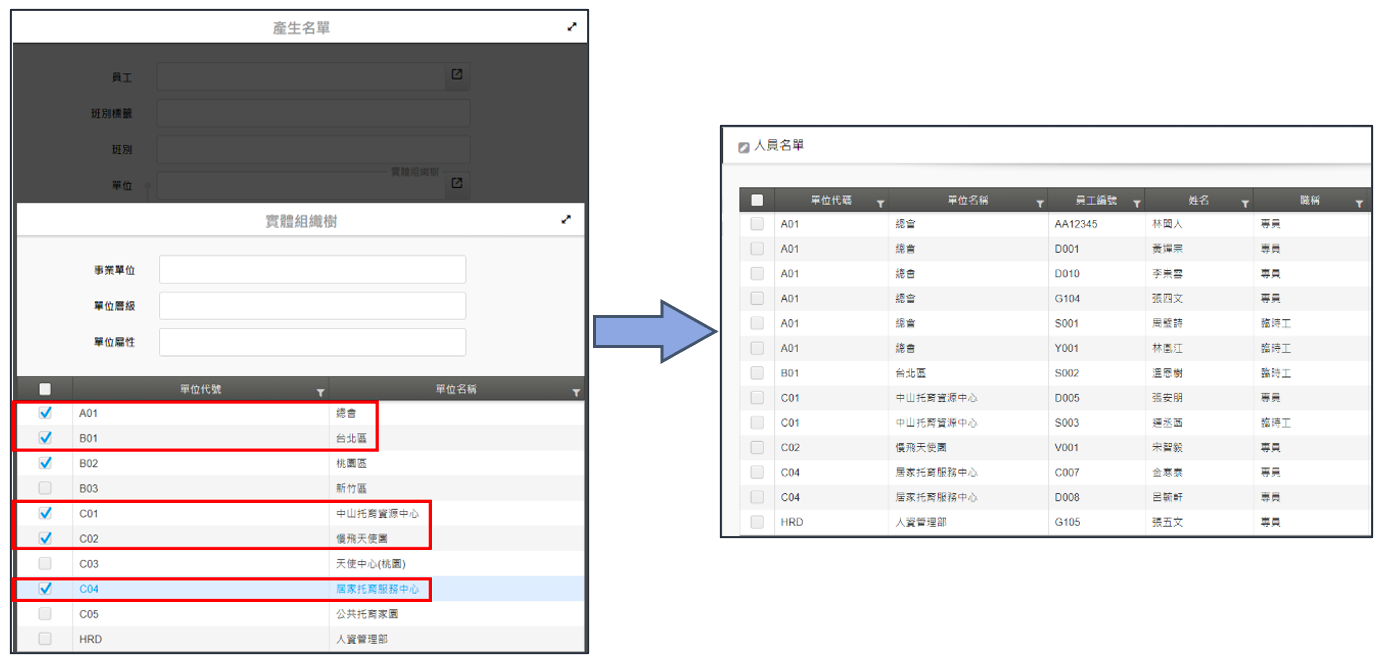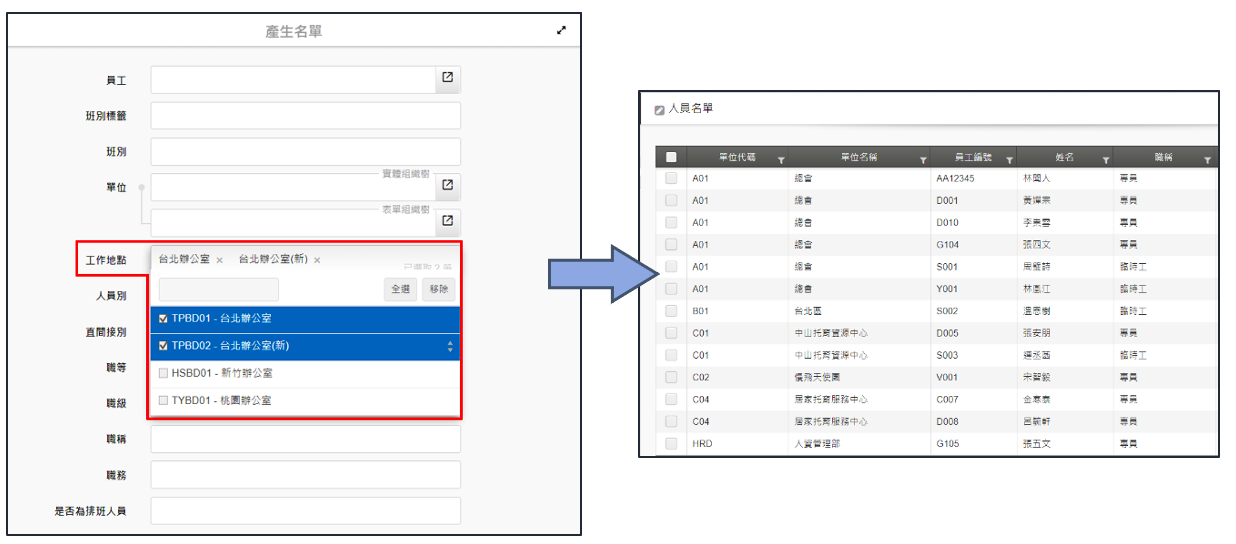 2) 若公司沒有設定【工作地點】,而是部門的成立是根據工作地建立的,如:業務部-台北組、業務部-新竹組,可以在產生名單時直接篩選部門,進而選取在該地區的員工。