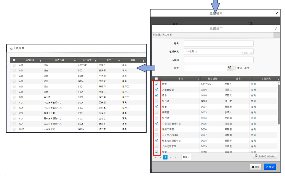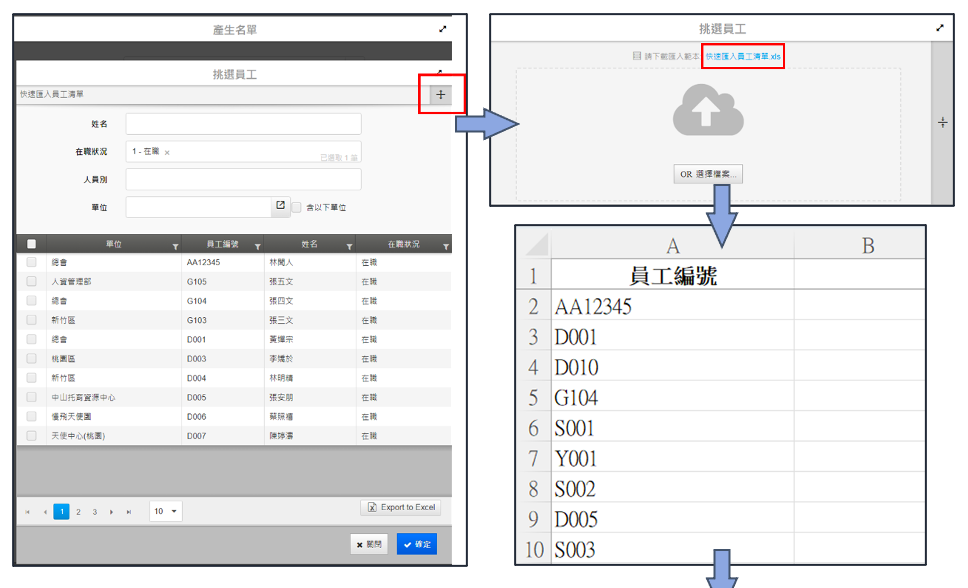 iii. 上傳後系統會自動勾選檔案中對應的員工,確認無誤後按【確定】>【保留並增加名單】完成產生人員名單。
