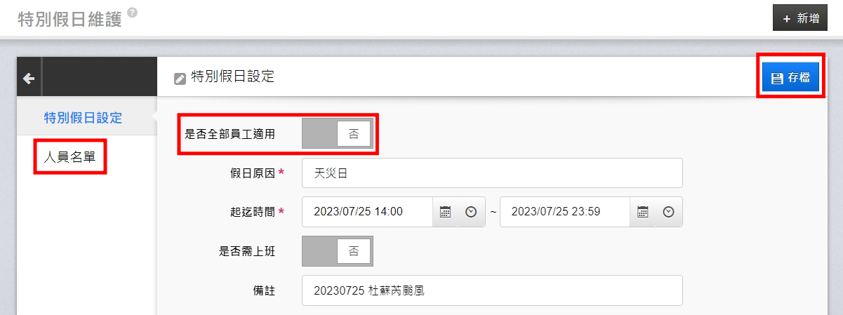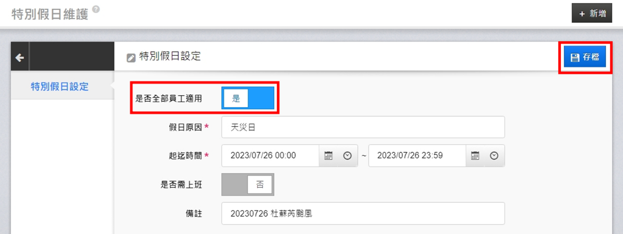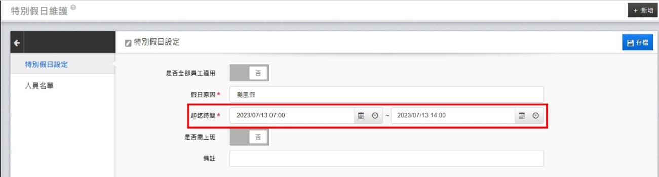 3. 特別假日【起迄時間】之內,【是否需上班】為『否』時正常排班時間與【起迄時間】重疊部分有刷卡紀錄視為超時,再由員工依實際狀況自行申請加班單。
