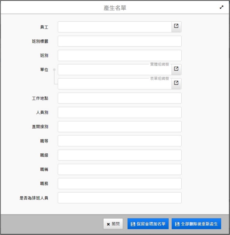 10. 根據需要設定【員工】、【班別標籤】、【班別】、【單位】、【工作地點】、【人員別】、【直間接別】、【職等】、【職級】、【職稱】、【職務】、【是否為排班人員】等條件,完成後點選【保留並增加名單】或【全部刪除後重新產生】產生名單。.jpg)