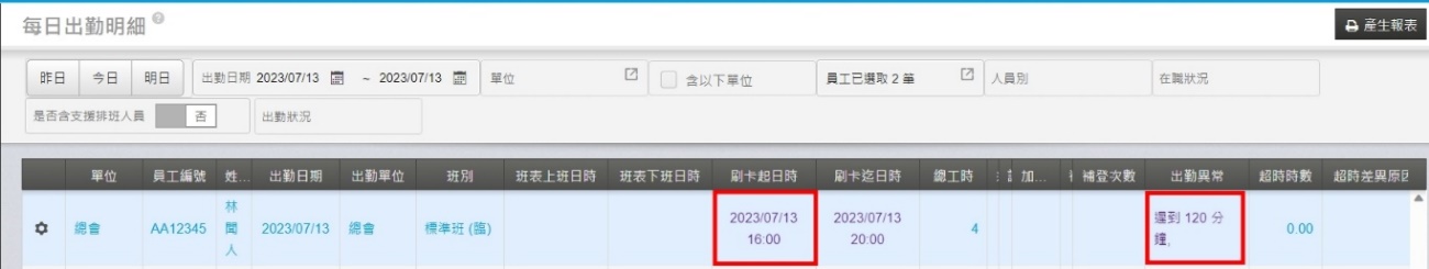 2023/07/21 14:00開始到當日23:59為特別假日,且無需上班,則14:00-17:48系統認定為加班,超時異常3.8小時。