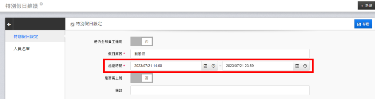 例:標準班時段為08:30-17:30;特別假日【起迄時間】為07:00-14:00,16:00打卡視為遲到120分鐘。