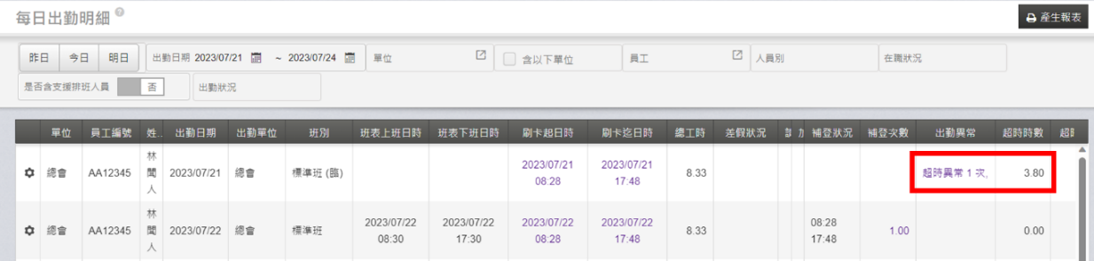 例:標準班時段為08:30-17:30;刷卡時間08:28、17:48。正常情況如07/22超時時數為0,無出勤異常。