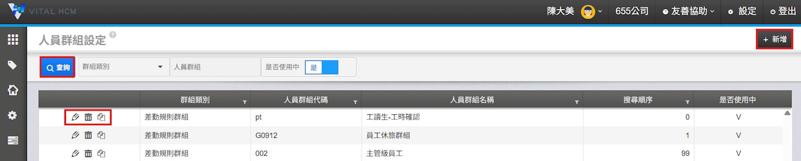 2. 直接點選【查詢】會顯示所有人員群組,點選【鉛筆】可以編輯;點選【垃圾桶】可以刪除,或是點選右上角【+新增】新群組。