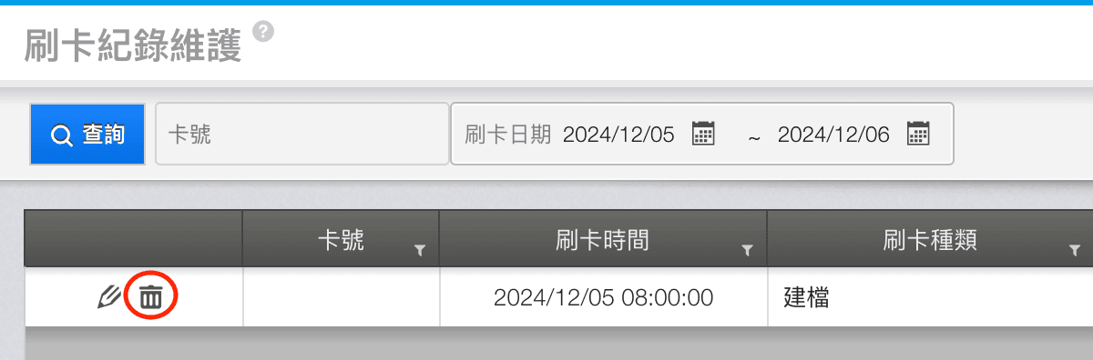 1. 請到「刷卡紀錄維護」查詢當天的刷卡紀錄,找到該員的資料