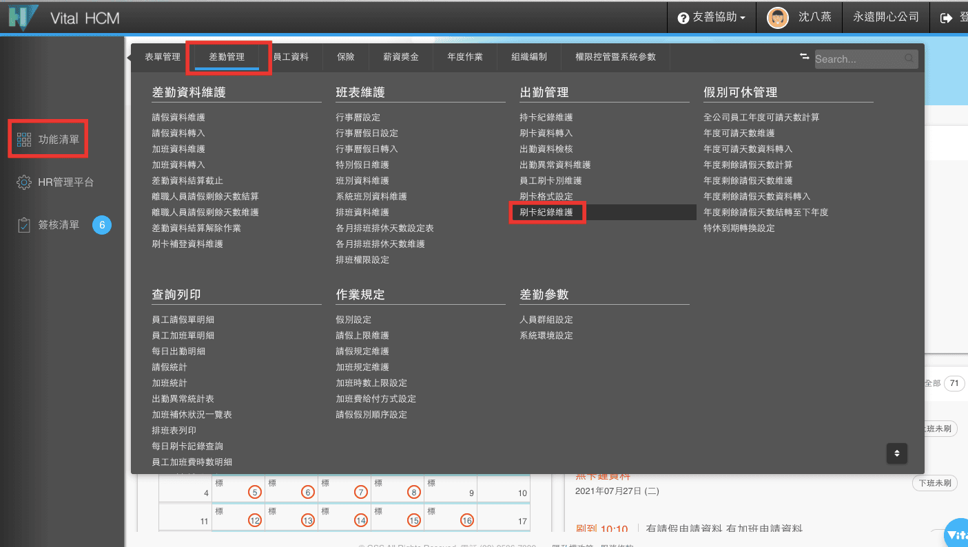 點選系統首頁左方的【功能清單】,接著點選【差勤管理>出勤管理>刷卡紀錄維護】。