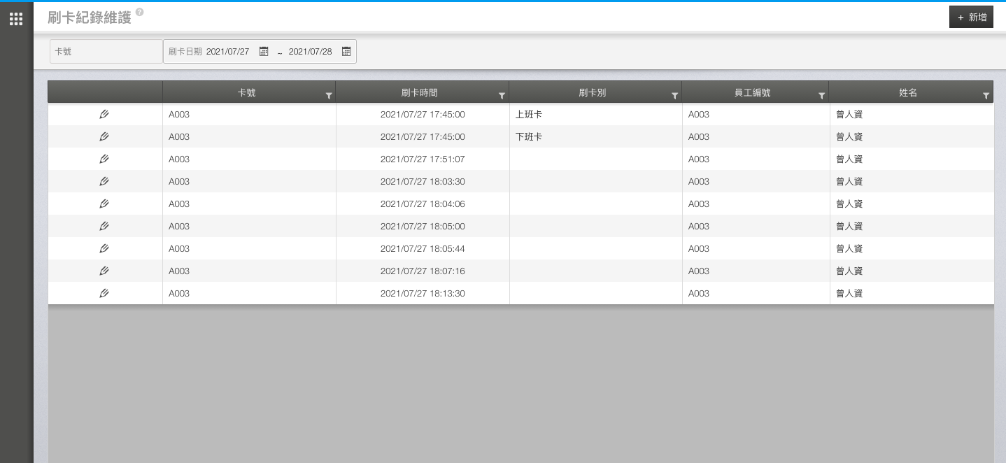 進入至刷卡紀錄維護的頁面後,即可查看員工的刷卡紀錄,可以在上方輸入卡號或日期區間,篩選刷卡紀錄。