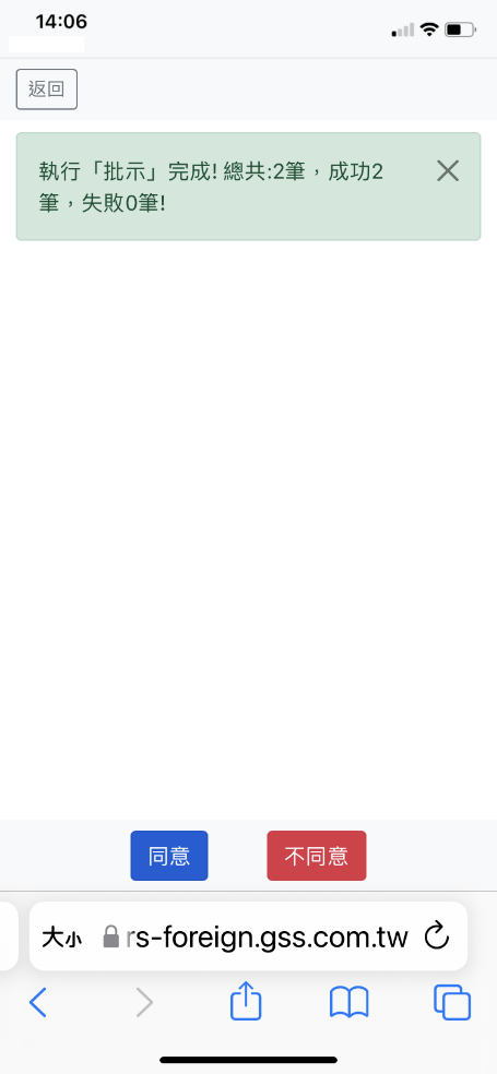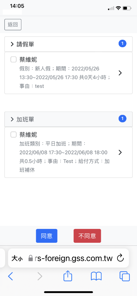 「功能選單」點選”批示/簽核”可快速審核表單。以下為例,預設帶出待批示表單,勾選欲批示的請假單、加班單,點選同意或不同意,顯示批示成功及筆數。