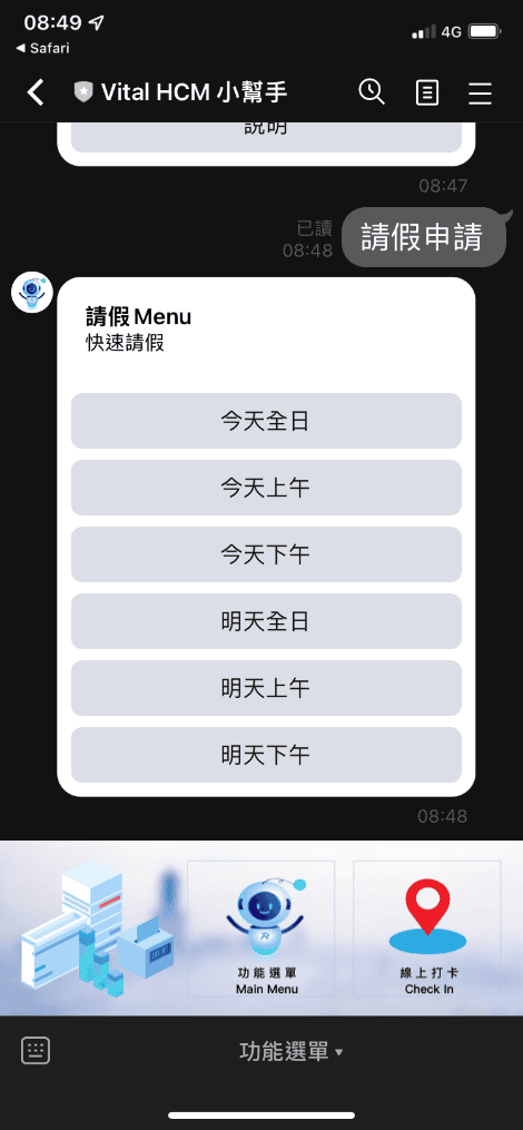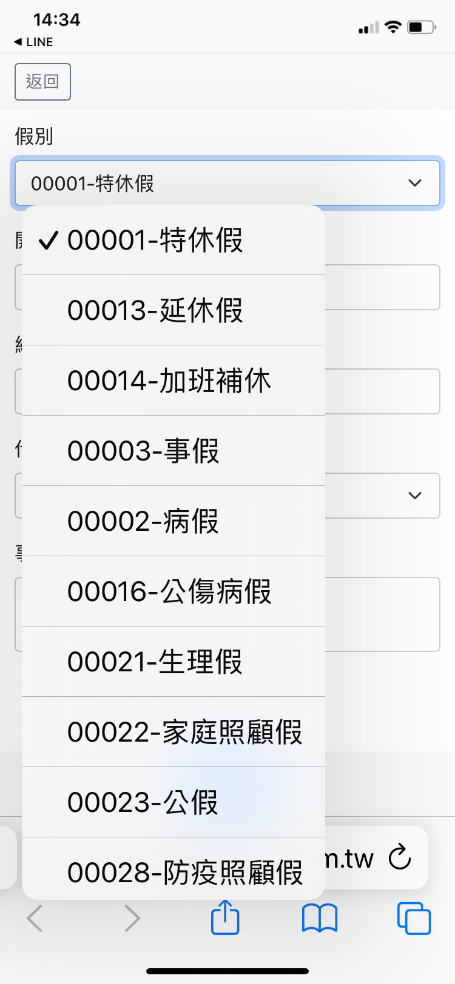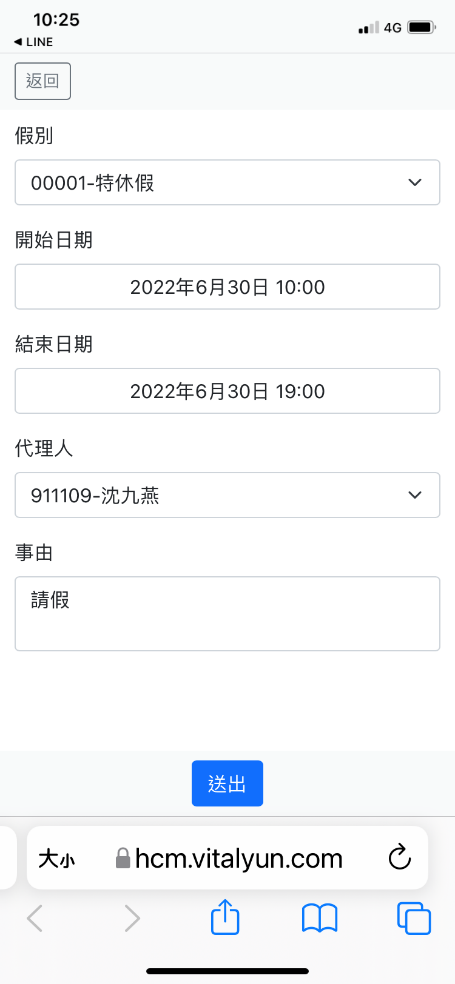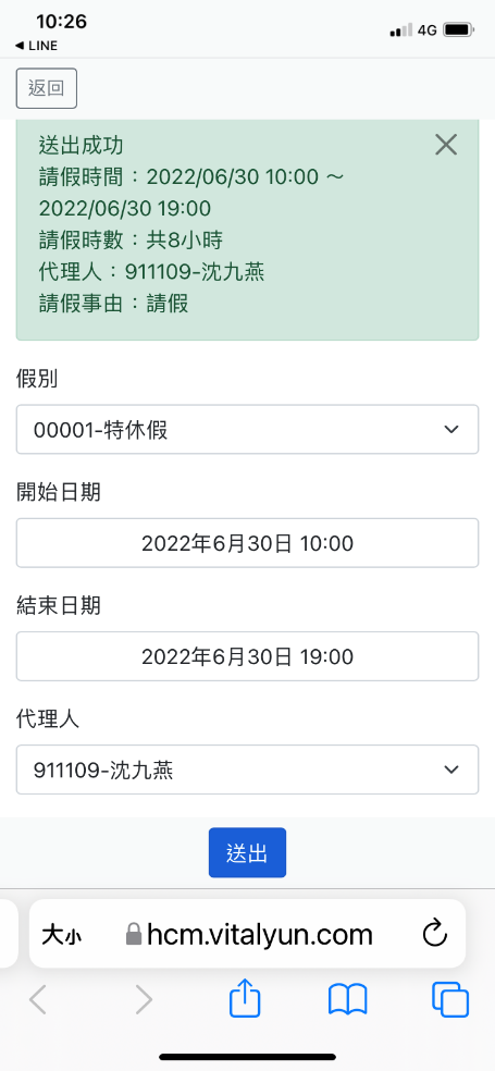 部份假別無法在LINE上快速申請,例:喪假、產假…等等,請改至HCM網頁功能申請。