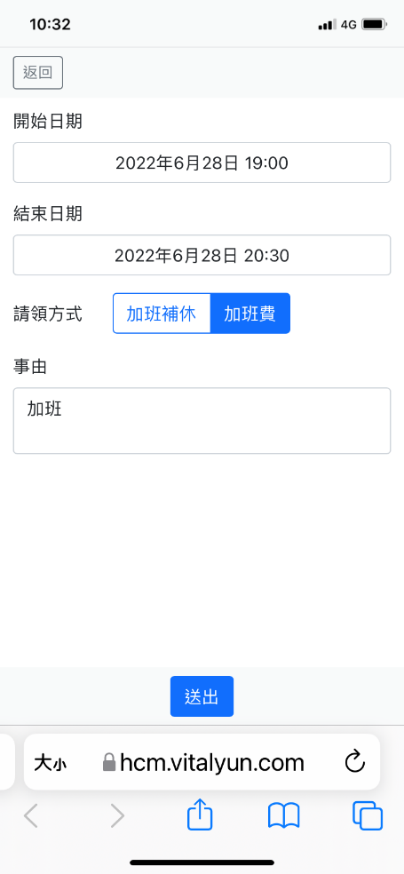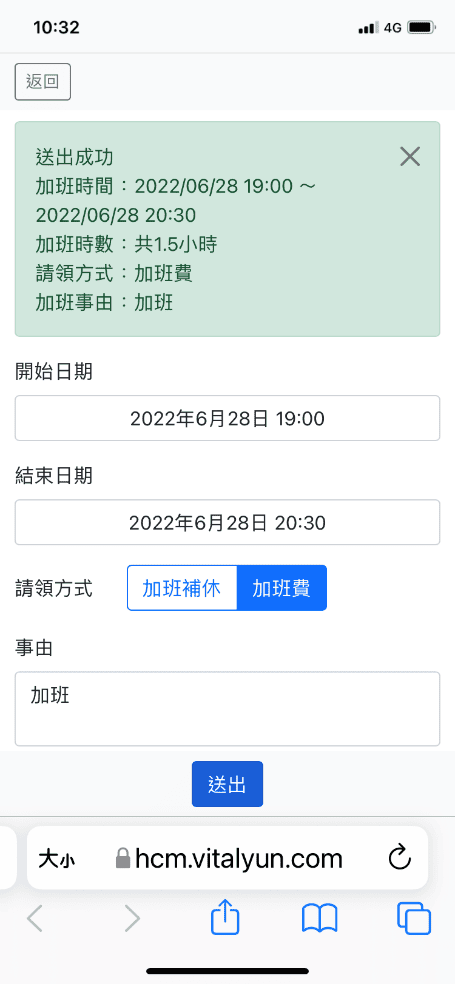 「功能選單」點選”加班申請”可快速申請加班。以下為例,預設帶出當天班表迄時,選擇請領方式及填寫事由後執行”送出”,並顯示送出成功的訊息。