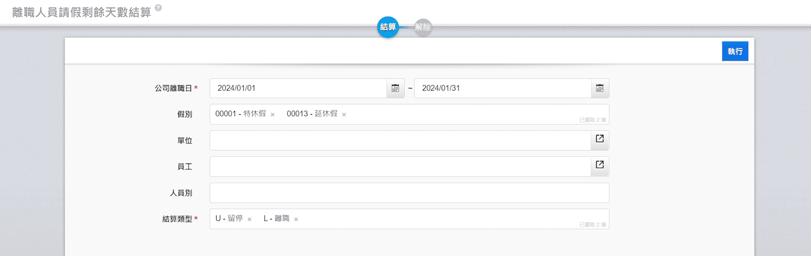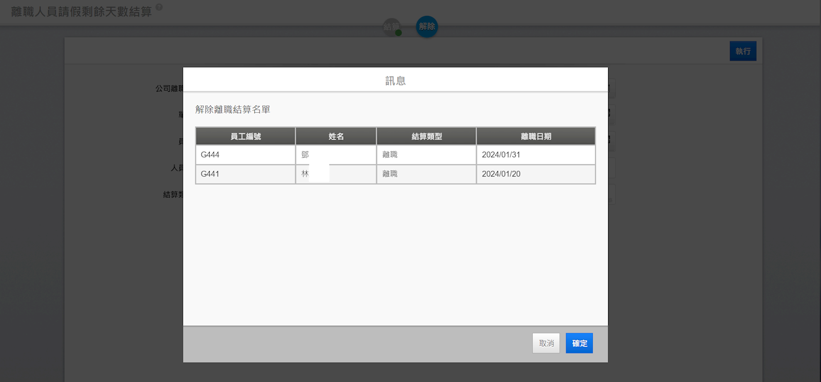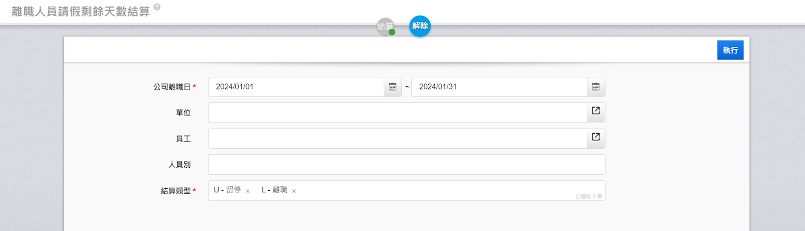 (2) 新增[解除]程序:當離職員工需重新結算休假,請先解除再重新執行結算。